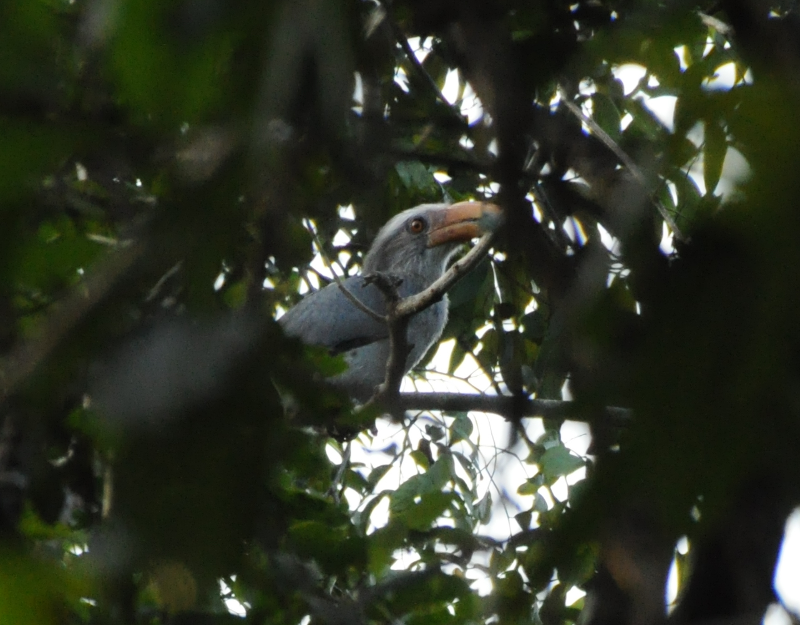 Just as we turn about, there's a rustling in the undergrowth off to our right again, and we catch a fleeting glimpse of Malabari Grey Hornbill. It's quite remarkable how easily such a large bird can disappear in the forest just by being still; each time we give our eyes a rest, it's a real test to find the bird again. It's worth it though; there's something quite Toucan-like about them in size and manner.